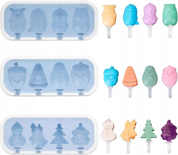 Foremka składa się z 12 wzorów,w tym truskawka, Sydney, arbuz, orzeszki piniowe, prosiak, pingwin, choinka, Święty Mikołaj itp. Urocze wzory mogą wzbudzić zainteresowanie dzieci robieniem lodów na patyku i pozwolić Tobie i Twoim dzieciom cieszyć się razem chłodnym latem.