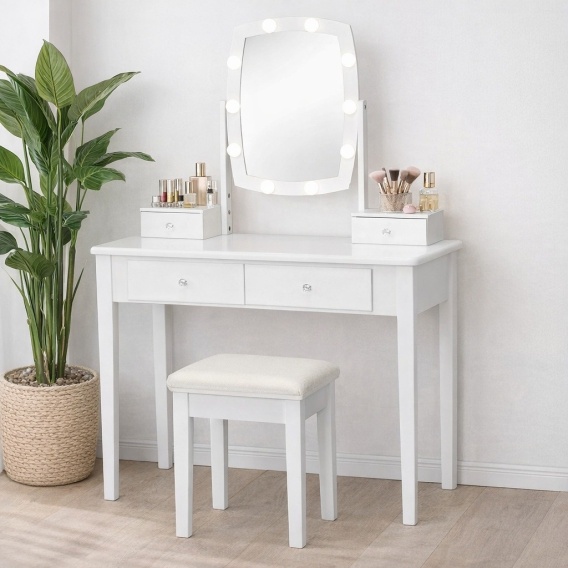 BIAŁA TOALETKA Z TABORETEM, OBROTOWYM LUSTREM Z ŚCIEMNIALNYMI ŻARÓWKAMI LED