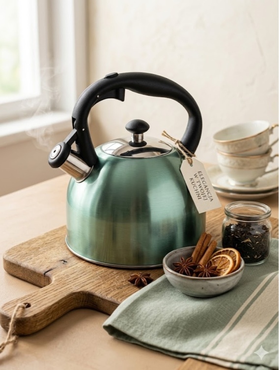 Doda powiewu świeżości i nowoczesnego stylu każdej kuchni! Prezentujemy wysokiej jakości czajnik wykonany ze stali nierdzewnej w unikalnym, satynowym odcieniu morskiej zieleni. To idealne połączenie tradycyjnego parzenia herbaty z designem, który przyciąga wzrok.