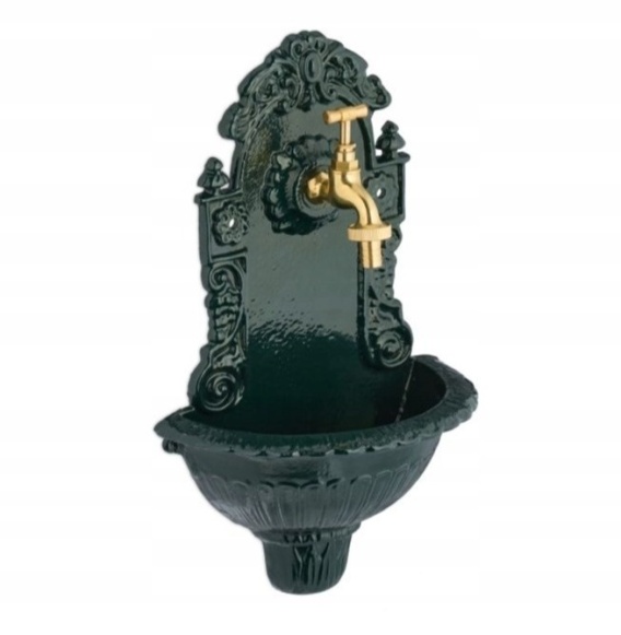Dzięki swojemu antycznemu wyglądowi, zielona fontanna naścienna stanowi dekoracyjny akcent na patio lub w ogrodzie. Niezależnie od tego, czy chcesz umyć brudne ręce, wyczyścić narzędzia ogrodowe czy napełnić konewkę, umywalka ogrodowa jest praktyczna w wielu zastosowaniach. Dekoracyjna fontanna jest również wyposażona w kran i tylne przyłącze do rury wodnej. Montowana na ścianie umywalka jest wykonana z malowanego proszkowo odlewu aluminiowego, dzięki czemu doskonale nadaje się do użytku na zewnątrz.