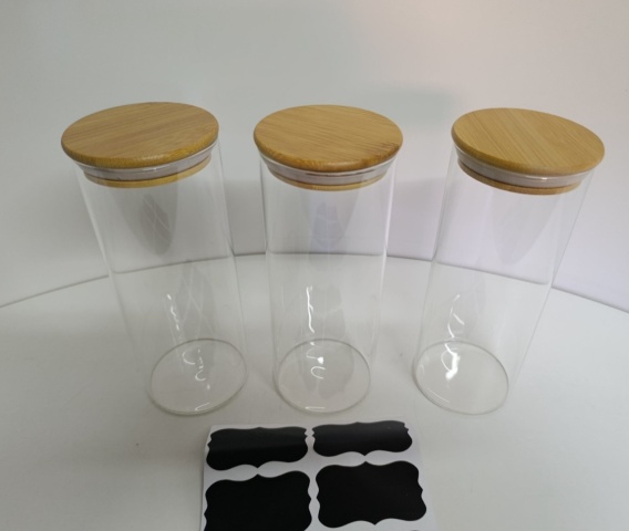 Pojemniki szklane do przechowywania, Zestaw 3 Pojemników z Pokrywką Bambusową + Etykiety