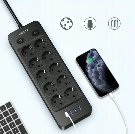 Listwa zasilająca z USB - listwa zasilająca z 10 gniazdami wtykowymi, trzy zintegrowane porty USB-A mogą jednocześnie dostarczać prąd, o całkowitym prądzie wyjściowym 2,4 A. Może ładować urządzenia cyfrowe, takie jak telefony komórkowe i tablety, w domu i w biurze.