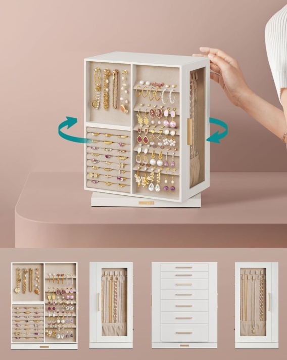 • Konstrukcja 360°: Szkatułka obraca się płynnie, co pozwala na błyskawiczny dostęp do biżuterii z każdej strony (z przodu są szuflady, z tyłu i po bokach miejsca na kolczyki oraz naszyjniki).
