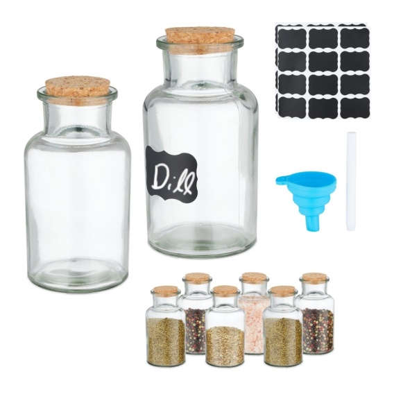 Ten zestaw 8 przezroczystych pojemników na przyprawy pozwala utrzymać porządek w asortymencie przypraw w domu. Dołączony lejek pomaga napełnić pojemniki na przyprawy w mgnieniu oka. Dzięki ozdobnej pokrywce z korka słoiczki na przyprawy można szybko zamknąć i przechowywać w stojaku na przyprawy lub szufladzie. Aby mieć odpowiednią przyprawę pod ręką tak szybko, jak to możliwe, można oznaczyć okrągłe słoiczki na przyprawy za pomocą etykiet.