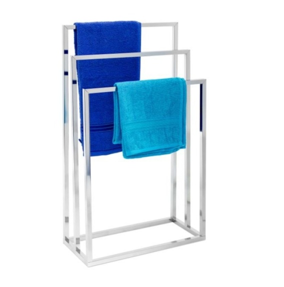 Wolnostojący stojak na ręczniki wykonany jest ze stali nierdzewnej. Jego chromowana powierzchnia o metalicznym wyglądzie dyskretnie i elegancko wkomponuje się w wystrój każdej łazienki. Przejrzysty, minimalistyczny design wieszaka podkreśla jego nowoczesny styl. Na 3 drążkach, które są umieszczone na różnych się wysokościach jest dużo miejsca na ręczniki kąpielowe i do rąk. Dołączona podstawa z tworzywa sztucznego zapobiega rysowaniu podłogi.