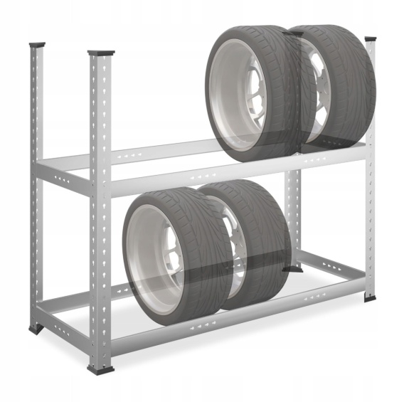 Szczegóły: Stojak na opony wykonany ze stali ocynkowanej – Wymiary (wys. x szer. x gł.): ok. 102 x 124 x 48 cm – Nośność: maks. 100 kg