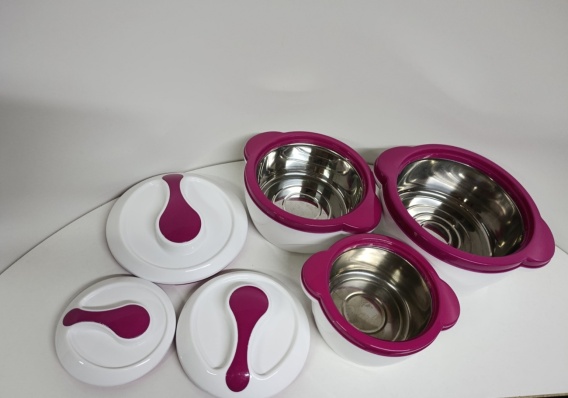 Przedmiotem aukcji jest praktyczny zestaw 3 pojemnych termomisek wykonanych ze stali nierdzewnej, z kolorowymi obudowami i szczelnymi pokrywkami. Idealne do przechowywania jedzenia, podawania potraw lub transportu na wynos (np. do pracy, na piknik, rodzinne spotkania).