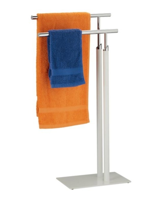 Ten wieszak na ręczniki przekonuje nie tylko nowoczesnym wyglądem, ale także funkcjonalnością. Może być używany jako półka na różne ręczniki, a także ubrania. Dzięki dwóm przesuniętym względem siebie prętom zapewniona jest dobra cyrkulacja powietrza, co oznacza, że ręczniki schną szybciej. Stalowa rama zapewnia bezpieczną podstawę, a gumowe nóżki pod wieszakiem na ręczniki prysznicowe zapobiegają zarysowaniom podłogi.