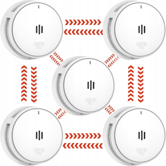 W przypadku wykrycia dymu przez jeden czujnik, wszystkie powiązane urządzenia uruchamiają alarm jednocześnie.